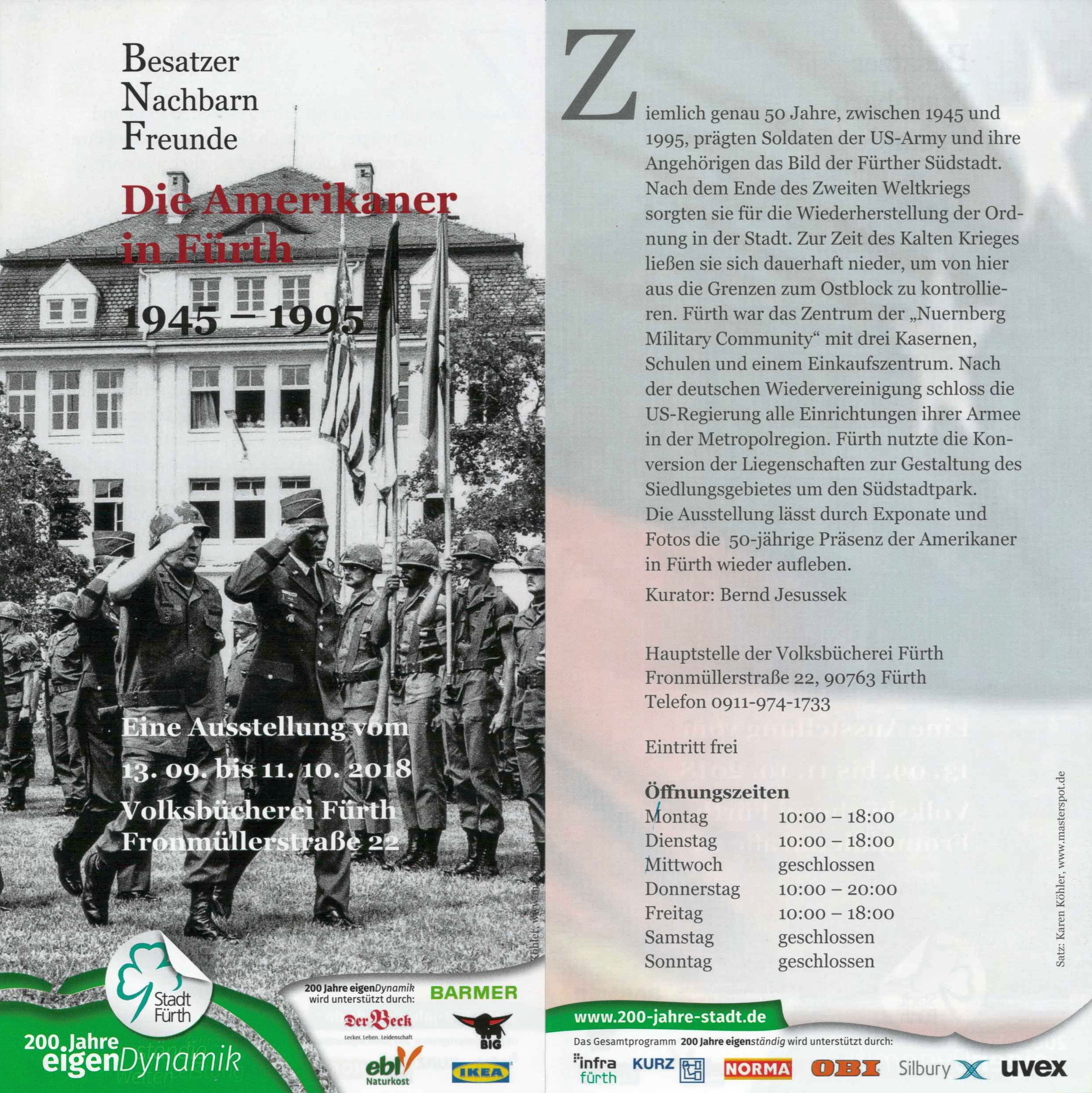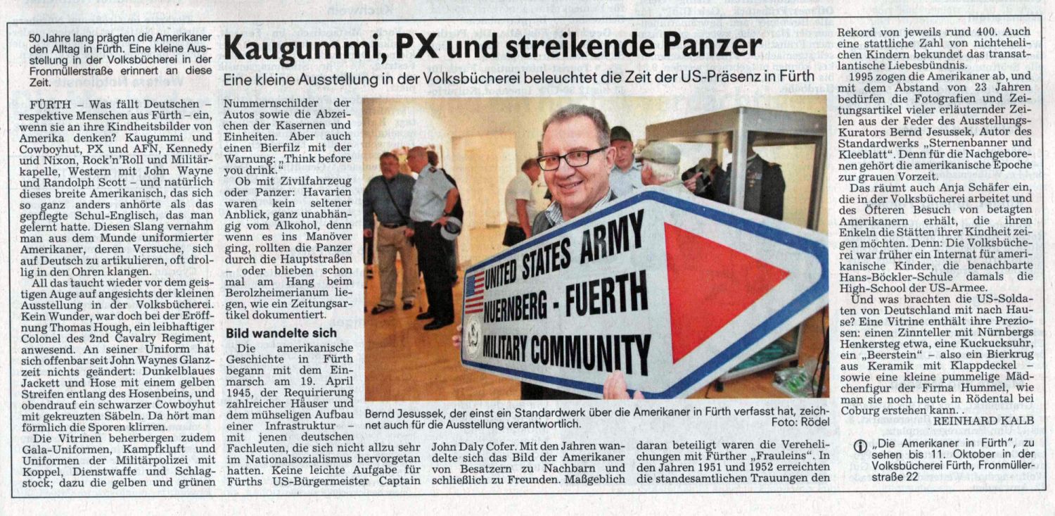 | 13 September 2018 - "Die Amerikaner in Fürth" Vernissage of the exhibition "Die Amerikaner in Fürth" - Many people were interested, when the Lord Mayor of Fürth, Dr. Thomas Jung, and the commander of the 2nd Armored Cavalry Regiment in Vilseck, Col. Thomas Hough, opened the exhibition. Report on "Fürther Nachrichten" | |